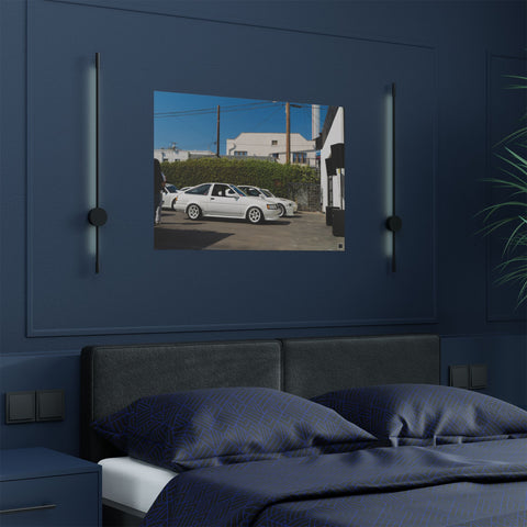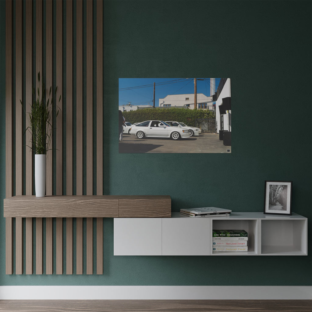 A timeless trio of white beasts—front and center is a clean, old-school Toyota Corolla with vintage flair, flanked by a stunning BMW E46 M3 that perfectly blends European aggression and elegance. Behind them, other machines like a EK Civic, and a Porsche fade into the background.